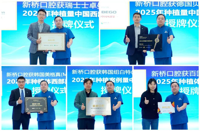 授牌环节,瑞士士卓曼(ITI)、德国贝格(BEGO)、韩国美格真(MEGAGEN)、韩国纽白特(NEOBIOTECH)、中国百固源(BAICBIO)代表依次上台,为新桥口腔颁发“2025年种植量中国西部第一”荣誉奖牌。